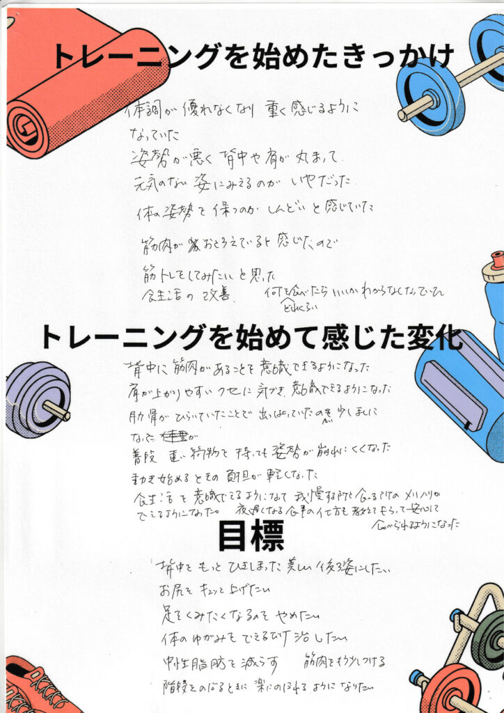 トレーニングを始めるきっかけは人それぞれですが、多くの方が「今の自分を変えたい」という想いを持っています。お客様の声にもあるように、トレーニングは単に体を鍛えるだけではありません。正しい知識を身につけ、ご自身の体の変化を感じることで、日々の生活がより前向きで、楽なものになっていきます。